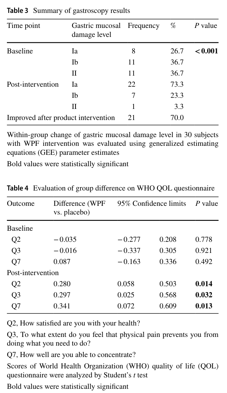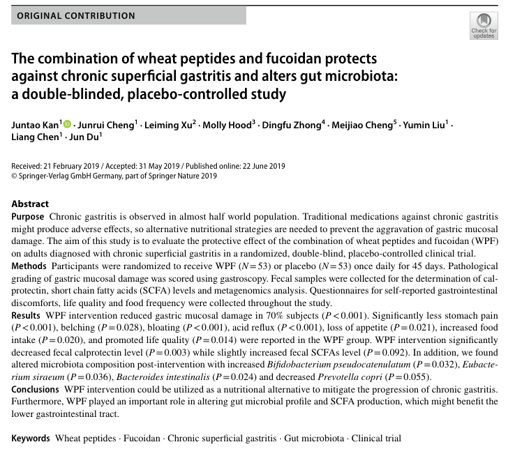 这项双盲安慰剂对照研究纳入 106 名慢性浅表性胃炎患者,随机分为两组,一组每日服用含 1g 小麦肽 + 0.3g 岩藻多糖的 WPF,另一组服用安慰剂,持续 45 天后效果惊人: