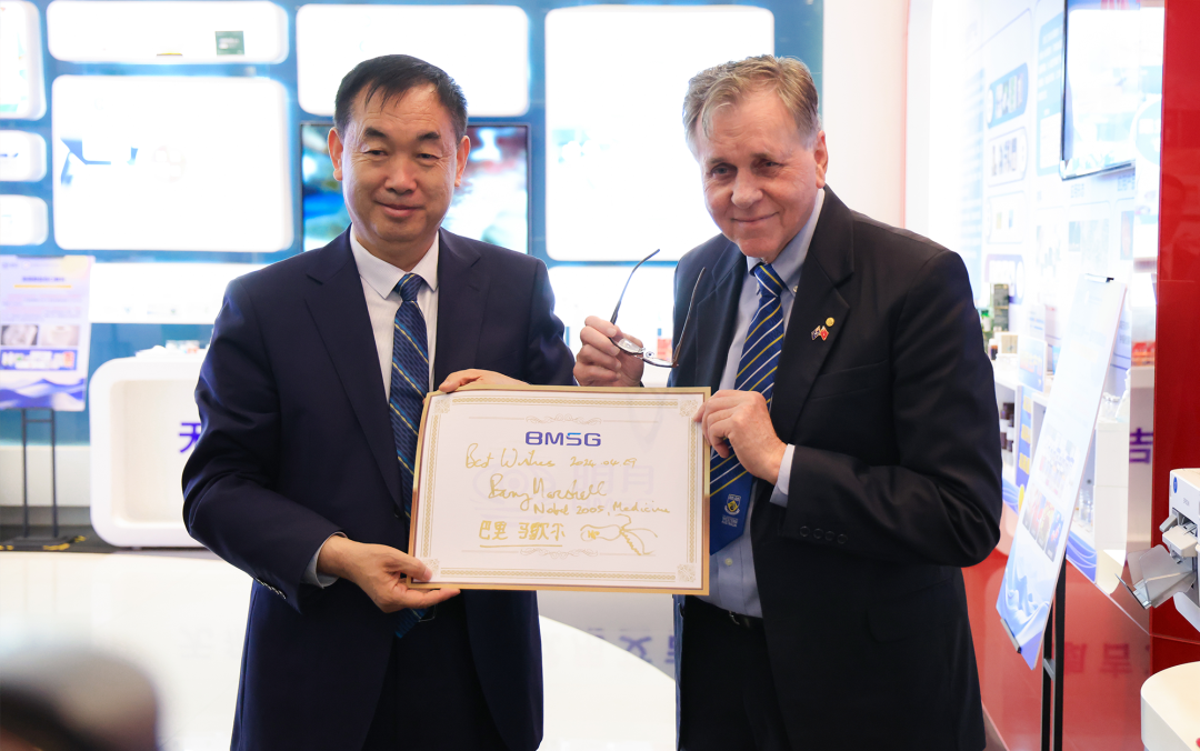 2024年4月,幽门螺杆菌发现者、诺贝尔生理学或医学奖得主巴里·马歇尔教授到访明月海藻集团,与集团领导及核心研发团队进行了深度交流。马歇尔教授对明月海藻依托海洋资源、深度开发海藻活性物质并打造高品质健康产品的成果给予高度评价。他表示:“明月海藻集团利用海洋资源,围绕海藻深度研发出这么多好的健康产品,突破了百年来人类在传统食品领域的研究局限,为消费者带来福音,相信这些产品将很快推向全世界。”同时,他对集团海洋食品加工与安全控制全国重点实验室研发团队在岩藻多糖防控幽门螺杆菌领域取得的研究成果也予以了充分肯定与认可。