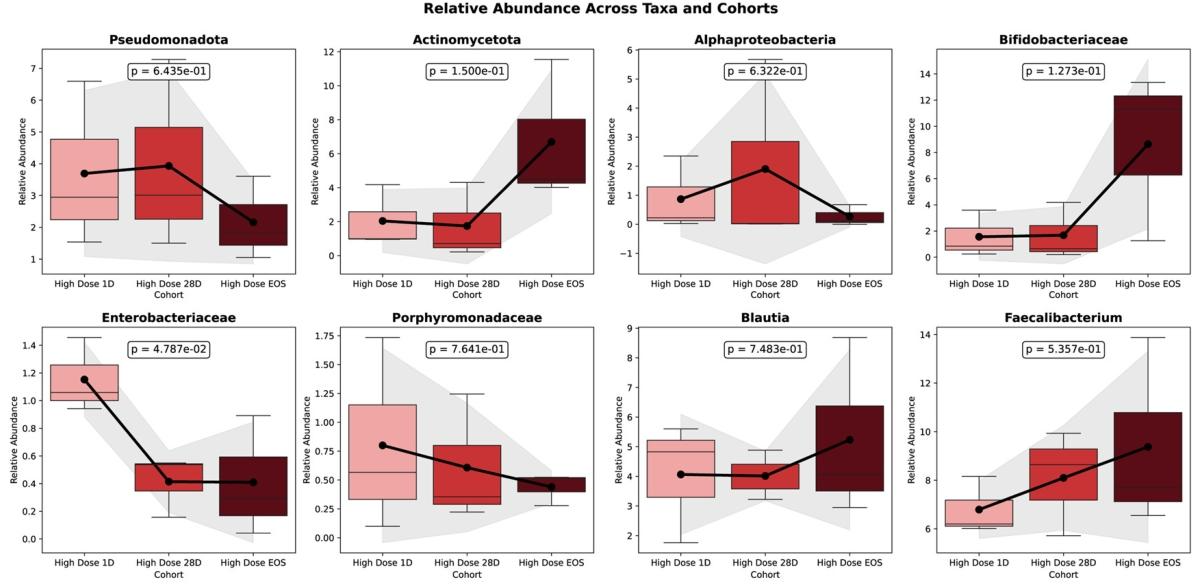 高剂量组效果显著:肠道菌群多样性显著提升,双歧杆菌(Bifidobacterium)、粪杆菌(Faecalibacterium)等有益菌数量大幅增加,这些细菌都是短链脂肪酸(SCFA)的 “生产高手”,而 SCFA 是维持肠道屏障、调节炎症的关键物质。同时,肠杆菌科(Enterobacteriaceae)等促炎菌群明显减少,肠道炎症风险降低。