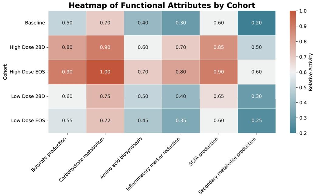 低剂量组温和获益:主要表现为双歧杆菌数量增加,但在菌群多样性和功能改善上效果有限,体现出明显的剂量依赖性。